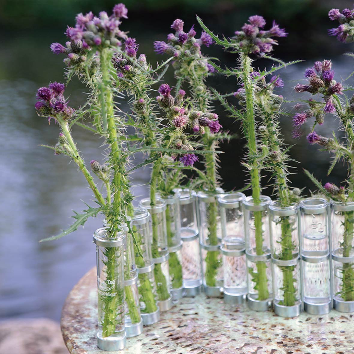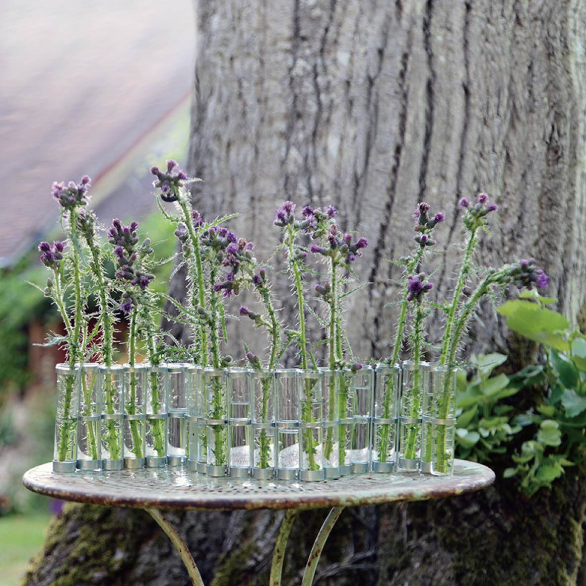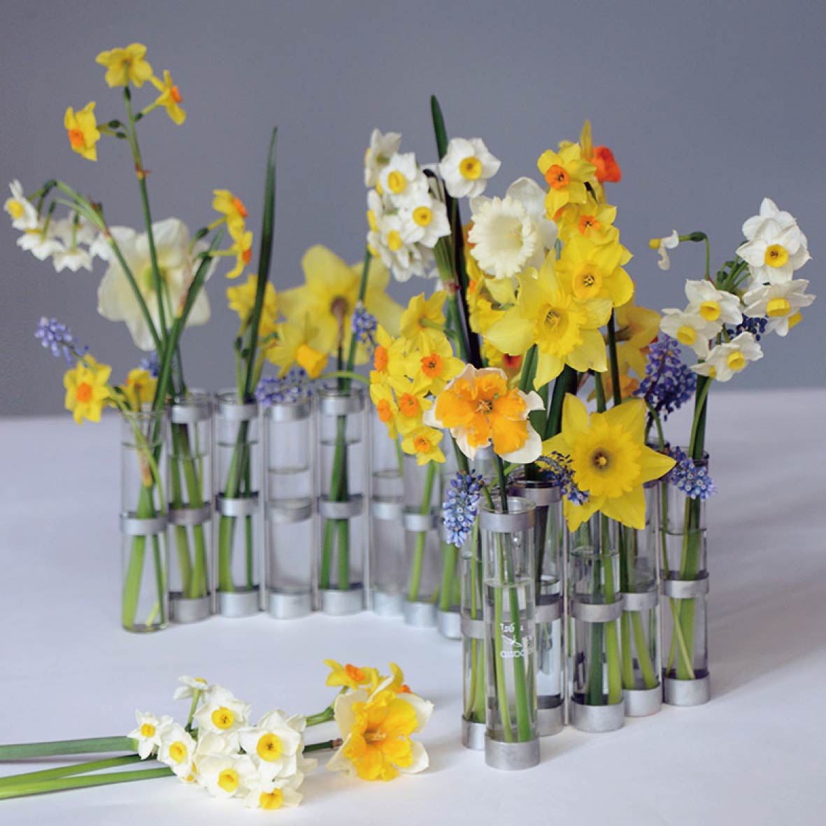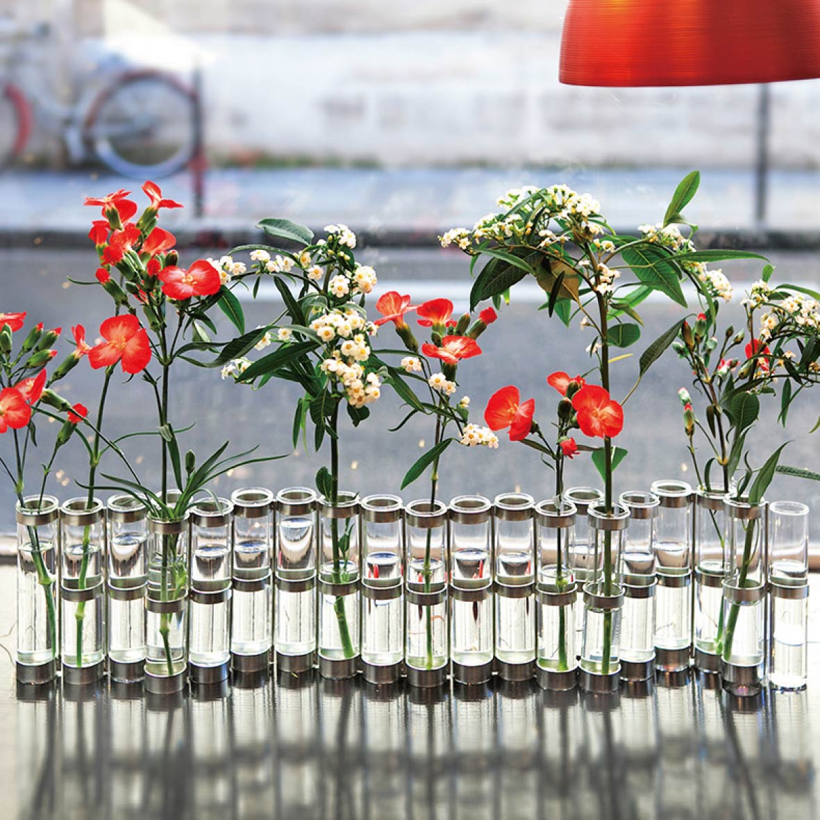 21本のチューブを金属製のリングで繋いだユニークなSサイズの花瓶。形を自由に変えて、無限の楽しみ方ができます。使用しているチューブは「ガラス管」ではなく、特別なスタイルの本物の試験管です。フラワーアレンジメントのスタイルや気分に合わせて、お好みのデコレーションをお楽しみいただけます。
