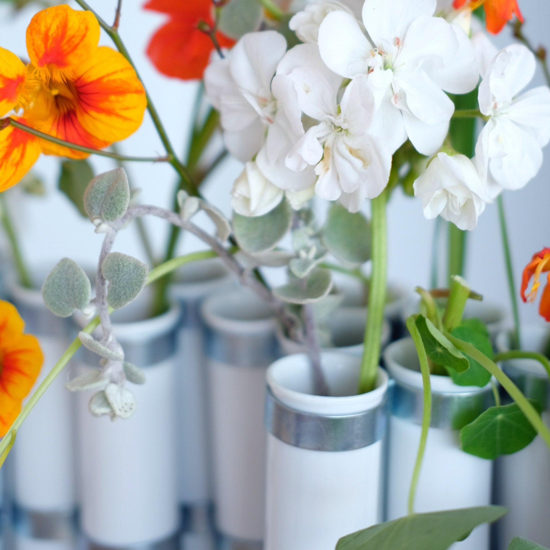 この花瓶は、一本一本の花を筒の中に入れ、16本の磁器製の筒を金属製のリングで繋ぎ合わせています。自由に形を変えることができるユニークな作品です。生け花の種類や気分に合わせてブーケを作る楽しさを体感でき、様々な形で飾って楽しめます。試験管を繋ぐ金具は取り外し可能で、直線、波型、ジグザグ、巻き付けるように並べることで、自由に形を変えることができます。試験管は金具から取り外すこともできます。また、試験管を取り出し、両端の金具を繋いで円形にすることもできます。